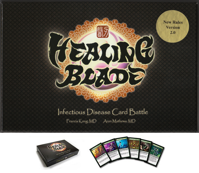 The Healing Blade card game idea was conceived of by Drs. Arun Mathews and Francis Kong, as a way to make learning about antibiotic use (and overuse) more interesting, entertaining, visually stimulating, and full of mnemonic aids. Game designer Brandon Patton and graphic designer Raul Gonzalez added the final polishes to make the game gorgeous and fun.